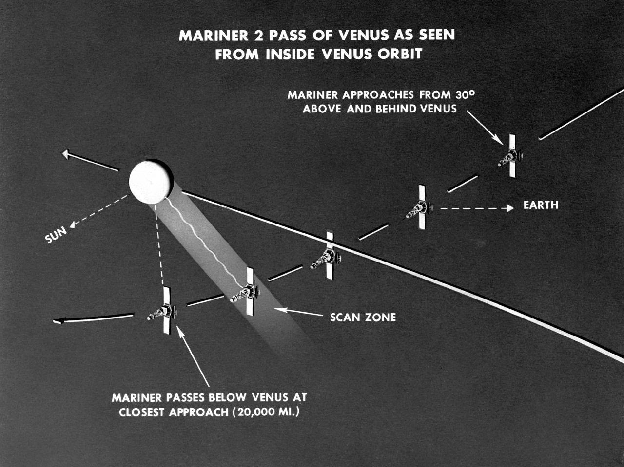 Mariner 2's closest approach to Venus — at a distance of 34,773 kilometers — took place over its dayside. The spacecraft then moved away from the planet, still transmitting.