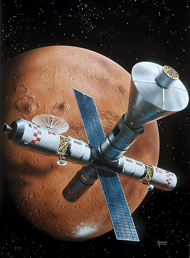 | Parkinson's "Mars in 1995!" spacecraft in Mars orbit. Spacelab-derived crew modules are labeled "NASA" and "esa." Numerals on the twin Mars orbit departure/Earth-orbit capture OTVs identify the Orbiters of which they are part. The Lander Module is at upper right, docked with the stores module, which is in turn docked with the Orbiter 2 docking module. Extended solar arrays place the LA OTV/crew cabin (labeled "3") in shadow. The painting shows a deorbit rocket pack strapped to the Lander Module heat shield; Parkinson also proposed using the Lander Module Reaction Control System thrusters for the deorbit maneuver ahead of landing on Mars. Image credit: © David A. Hardy/http://www.astroart.org |