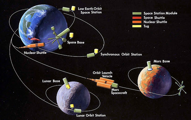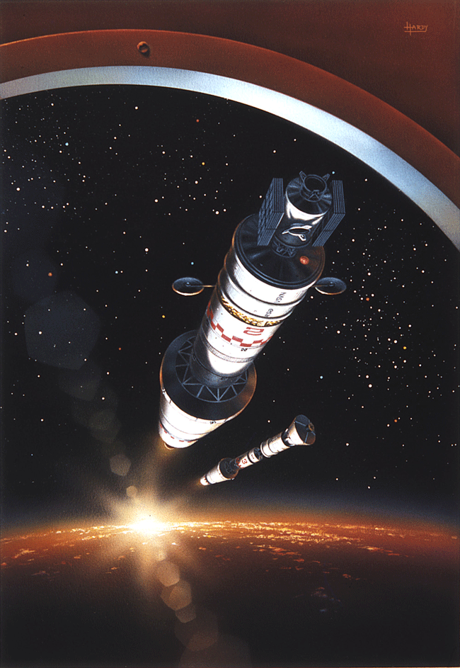 His long list of useful hardware included, in addition to the Space Shuttle, three systems designed mainly for rocket propulsion: a powerful Heavy Lift Vehicle (HLV) capable of launching into low-Earth orbit payloads larger than the Shuttle Orbiter's payload bay could accommodate; a Heavy Boost Stage (HBS) roughly the size of the S-IVB stage NASA used in the late 1960s/early 1970s to launch Apollo spacecraft out of Earth orbit toward the moon; and a drum-shaped high-performance Orbital Transfer Vehicle (OTV) with an optional crew cabin.