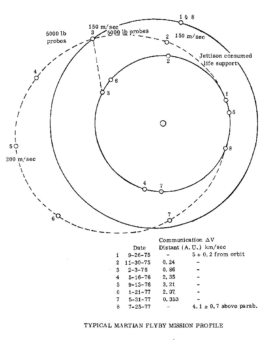 Ruppe's team provided an example heliocentric orbital plot for a manned Mars flyby mission leaving Earth on 26 September 1975. The dashed line on the plot represents the flyby spacecraft path around the Sun. Flight to Mars would require 130 days.