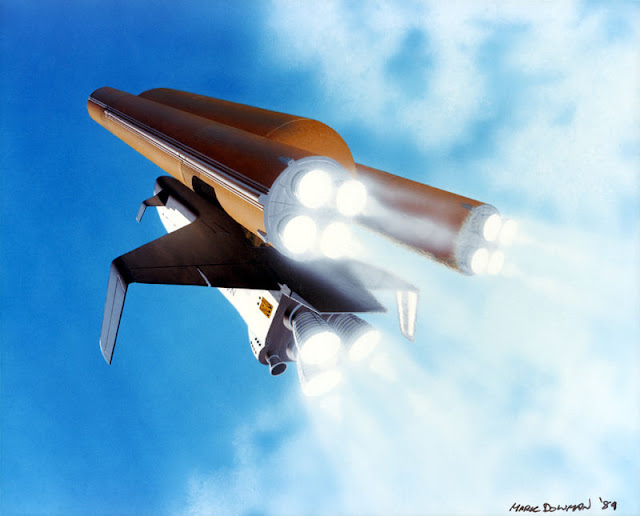 Although a good case can be made for calling LaRC's Shuttle II the Shuttle II, it was in fact not the only proposed Shuttle II design. The Advanced Programs Office at NASA Johnson Space Center (JSC) in Houston, Texas, put forward the sleek Shuttle II design depicted in the last seven images of this post. They portray JSC's Shuttle II as it would appear over the course of a typical mission.