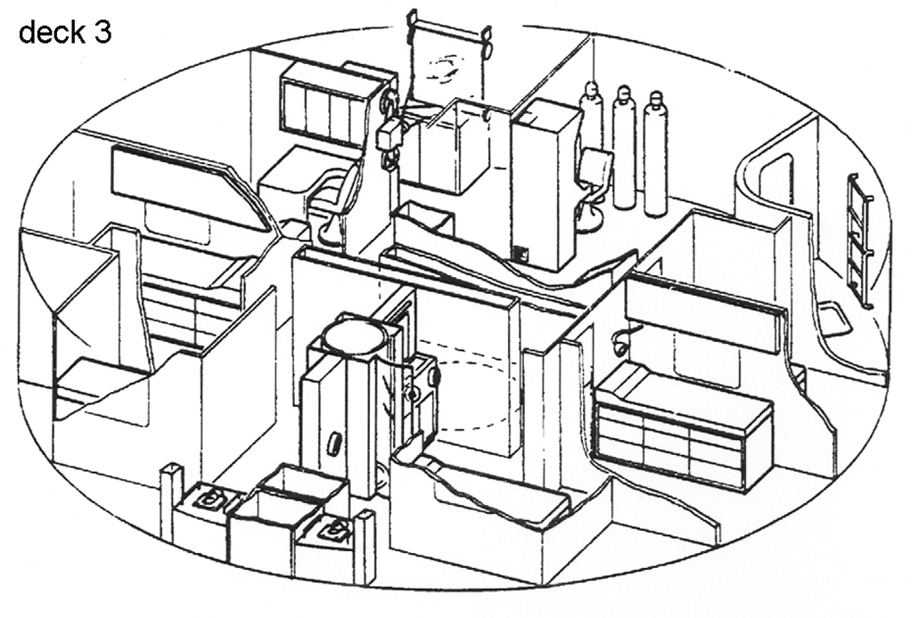 Deck 3 would resemble Deck 2, except that its large stateroom would be set aside for the Chief Science Investigator and a repair shop would replace the PCC. Deck 4, the laboratory deck, would include experiment equipment for eight major scientific disciplines, an airlock with an extendable boom for exposing experiments to space, a small backup control center, and two docking units.