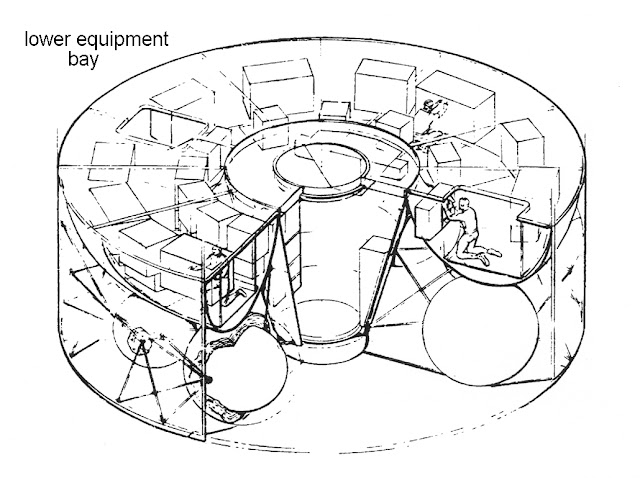 Upper and lower equipment bays atop Deck 4 and below Deck 1, respectively, would each contain a conical "tunnel" airlock, a pressurized "torus" ring for storing supplies and spare parts, and an section open to vacuum containing spherical storage tanks for life-support gases and liquids. The equipment bays would also house propellant tanks supplying the Phase B Station's attitude-control thrusters. Spacewalking astronauts would leave the station through the lower tunnel. Rectangular openings in the Deck 1 floor and the Deck 4 ceiling would enable astronauts to enter the storage rings.