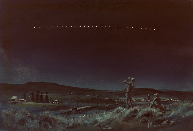 Image 12), we see the SPS fleet near the end of 2015; that is, halfway through the 30-year construction program, when 30 satellites would form a bright line across the southern night sky as viewed from the contiguous United States. A DOE document explained that each satellite would shine a little brighter than Venus. The satellites would appear about as far apart as the three stars making up Orion's belt. Widely available 7 x 50 binoculars would reveal each satellite's rectangular shape to Earth-bound observers.