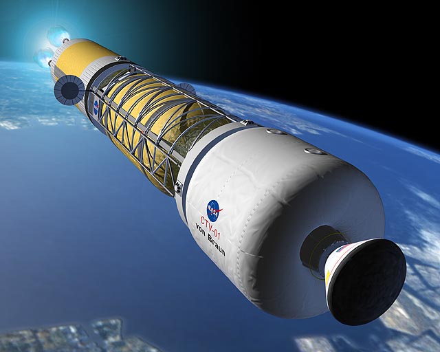 SDHLV 1 would launch BNTR stage 1 with 47 tons of LH2 propellant on board. Each BNTR DRM mission would need three 28-meter-long, 7.4-meter-diameter BNTR stages. The BNTR stages would each include three 15,000-pound-thrust BNTR engines developed as part of a joint U.S./Russian research project in 1992-1993.