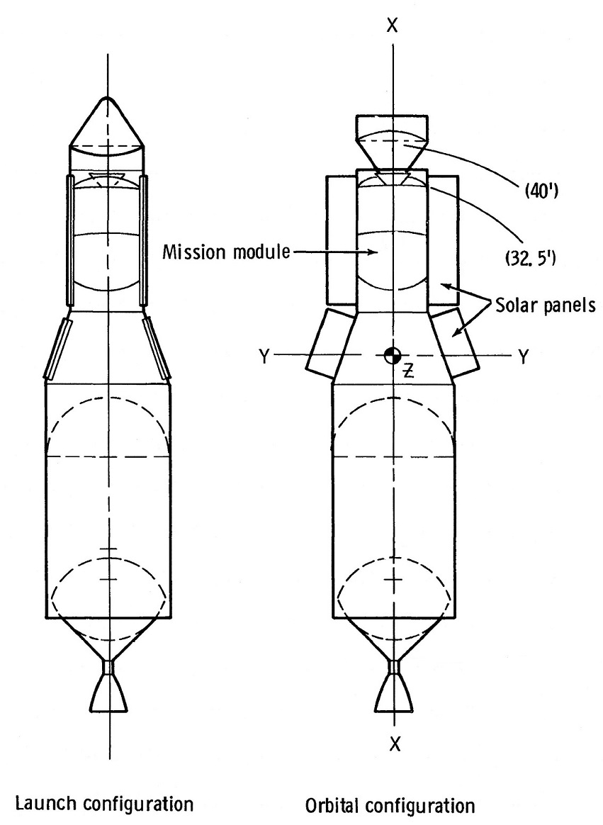 The four-segment SLA, the NAA-built adapter that linked the Apollo CSM to the top of the Apollo Saturn V S-IVB third stage, would form the structural basis for the piloted flyby MM, the crew's home and workplace during interplanetary travel. NAA did not design an MM specifically for its piloted flyby study. Instead, it tapped the Apollo Orbital Research Laboratory, a 1962-1963 NAA concept for a small space station based on the SLA structure.