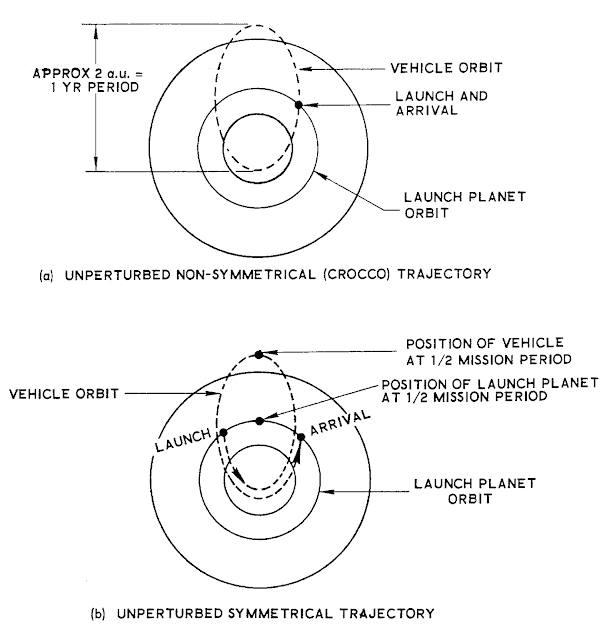 The Crocco trajectory would require more propulsive energy than the symmetric trajectory, Aeronutronic found. The amount of energy required would depend on the moment during the launch opportunity that the spacecraft left Earth orbit. Aeronutronic, however, selected single representative values for preliminary design purposes.