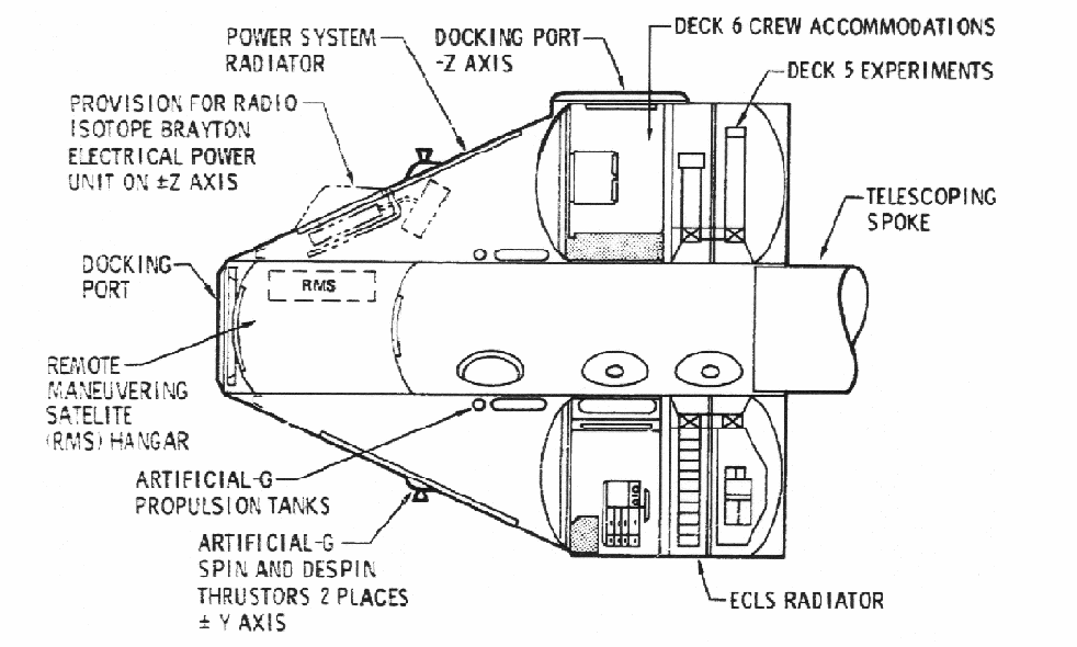 Earth-orbit departure completed, the six-man crew would reconfigure their spacecraft for the interplanetary voyage. The twin cylindrical living modules, each with an empty mass of 4.5 tons, would extend on hollow telescoping arms, and one SNAP-8 would deploy a radiator panel and begin generating electricity (the other would be held in reserve in case the first failed).