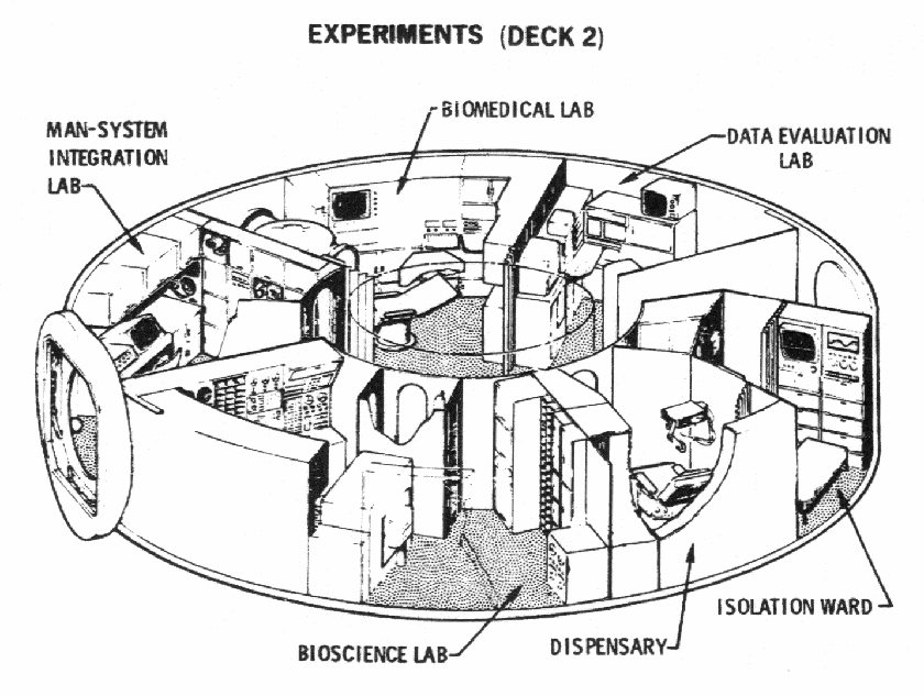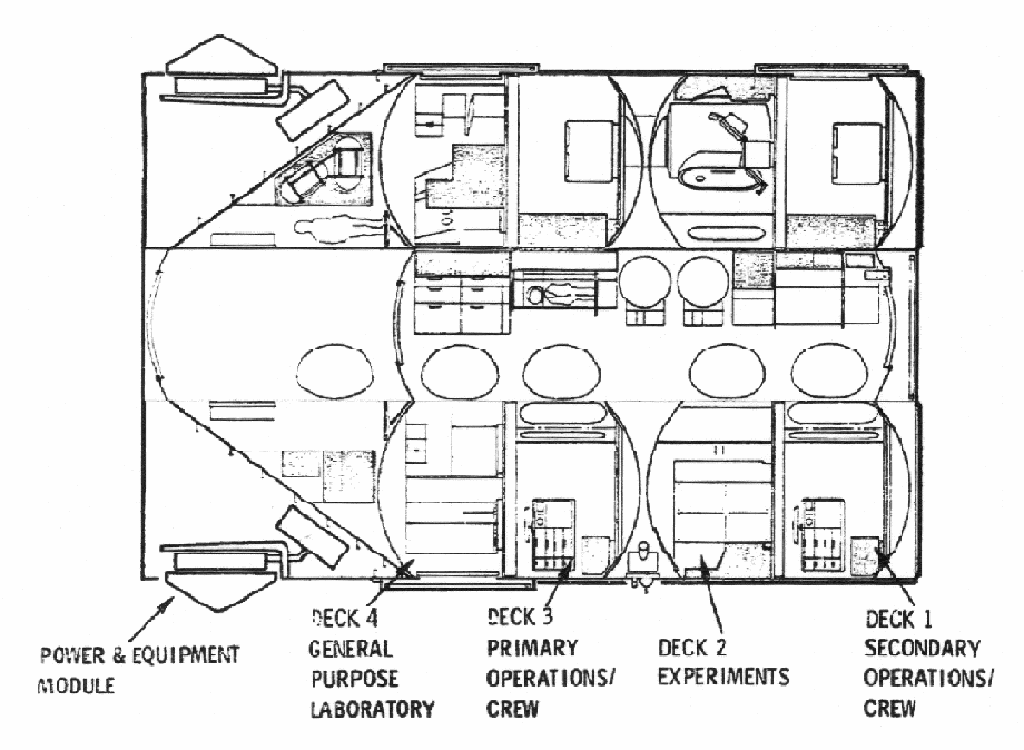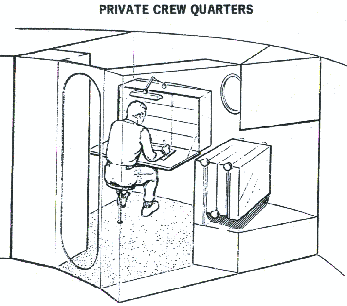 The six-man crew would follow a complex schedule designed to combat boredom while providing adequate rest and recreation. Except for sleep, crew activities would occur in two-hour blocks. The crew would include a Commanding Officer, an Executive Officer, a Flight Surgeon, and three astronauts identified simply as "crew members." All six would take it in turns to serve as duty officer in the command center/shelter, maintenance and repair crewmember, and scientific activity crewmember. The Commanding Officer and Flight Surgeon would not, however, take part in hazardous repairs (for example, those involving spacewalks).