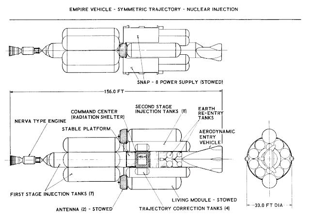 Aeronutronic envisioned a 156-foot-long, 33-foot-wide symmetric dual-planet flyby spacecraft with a single 18,300-pound NERVA engine capable of generating 50,000 pounds of thrust. A tungsten shield at the front of the drum-shaped NERVA reactor would create a radiation shadow that would encompass the crew modules during Earth-orbit departure.