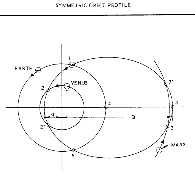 [b]y attacking the areas of interest at this early date[,] it will be possible to obtain a clearer picture of the requirements for early manned planetary and interplanetary flight. Thus the nation's resources, and the NASA and other United States space programs[,] can be oriented toward long range goals at an early date. [EMPIRE] represents an unusually early attack on this type of analysis.Aeronutronic looked at two interplanetary trajectories for its dual-planet piloted flyby mission. The first was dubbed the Crocco trajectory because it was based on the scenario in Crocco's 1956 paper. The second was the symmetric trajectory, which would see the flyby spacecraft swing around the Sun one-and-a-half times. It would fly past Mars halfway through its mission and would cross the orbit of Venus once before the Mars flyby and once after. It would swing past Venus during one of the orbit crossings.